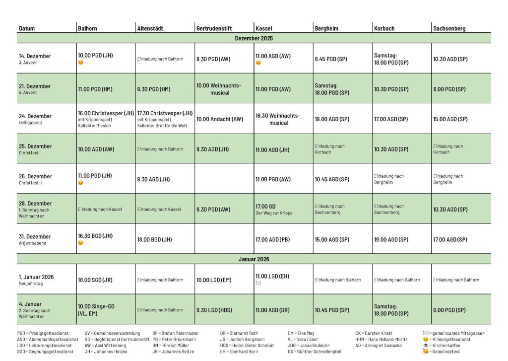 | Heiligabend | 24.12.2025 | 10.00 Andacht (AW) | 16.30 Weihnachtsmusical (AW) |